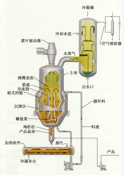 產品簡介:DTB型真空蒸發(fā)結晶器 DTB蒸發(fā)結晶器(導流筒結晶器)是一種高效率的結晶設備,由PLC控制物料溫度,其獨特的結構和工作原理決定了它具有傳熱效率高、配置簡單、操作控制方便、操作