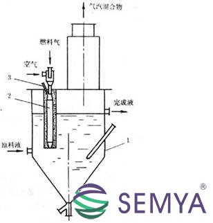 前述的各種蒸發(fā)器都是間接加熱的,工業(yè)上有時(shí)還采用直接加熱蒸發(fā)器,圖5—7所示的浸沒燃燒蒸發(fā)器就是直接加熱的蒸發(fā)器。將一定比例的燃燒氣與空氣直接噴人溶液中,燃燒氣的溫度可高達(dá)1200~1800℃,由于氣、液間的溫度差大,且氣體對(duì)溶液產(chǎn)生強(qiáng)烈的鼓泡作用,使水分迅速蒸發(fā),蒸出的二次蒸汽與煙道氣一同由頂部排出。