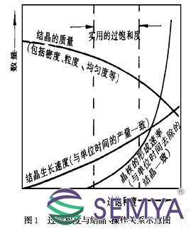 對結晶影響最主要的因素是溶液的過飽和度,如果溶液沒有過飽和度,晶核既不能生成,結晶也不能生長。過飽和度大一些對生產有利,因為推動力大,晶核的形成速率和結晶的生長速率都大,但也不是越大越好。如果料液過飽和度太大,晶核形成速率很快上升,使結晶生長速率降低,會出現(xiàn)產品粒度過細,影響產品質量。過飽和度與結晶、操作關系示意如圖1 所示