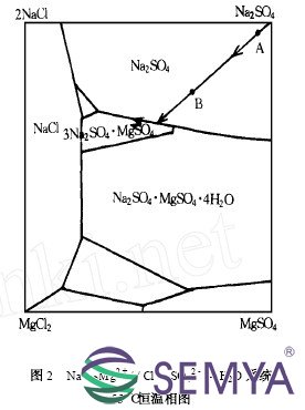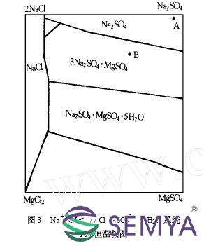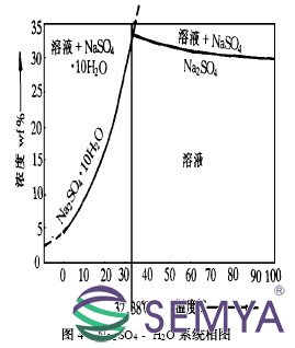 無水硫酸鈉生產所使用的原料中,除了主要的Na+ 、SO42 -離子外,一般都含有少量的Ca2 + 、Mg2 + 、和Cl -離子,生產時蒸發(fā)器內壓力、溫度等條件保持不變,隨著蒸發(fā)的進行,結晶的硫酸鈉不斷取出, 料液中Ca2 + 、Mg2 + 離子濃度相對增大, 體現(xiàn)在Na + 、Mg2 + // Cl -、SO42--H2O 相圖上,如開始在A 點,生產一段時間后體系移到B 點見圖2, 繼續(xù)生產,體系逐漸由Na2SO4 的結晶區(qū)移到Na2SO4 與復鹽3Na2SO4 ·MgSO4 的共飽線上,此時無水鈉鎂礬開始析出,在操作溫度不變情況下,體系將沿此共飽線移動,產品質量開始下降。如果溫度升高時,Na2SO4 的結晶區(qū)逐漸縮小,而3Na2SO4 ·MgSO4 的結晶區(qū)逐漸增大, 體系落在了3Na2SO4 ·MgSO4的結晶區(qū),顯然此時已不是我們所需要的產品了見圖3 。由于無水鈉鎂礬的結晶顆細小,在粘度較大的硫酸鈉溶液中不易沉降,蒸發(fā)罐內就會呈現(xiàn)糊狀,使蒸發(fā)無法正常進行,結晶也不會再繼續(xù)長大,排出的料液經離心機脫水非常困難,濕硝中母液含量較大,氣流干燥也無法正常運行,產品放置時間長了便結為大塊。為避免上述現(xiàn)象發(fā)生,除對硝液進行凈化外,應適當降低排料溫度,即降低蒸發(fā)終溫。從圖2 、圖3 中可以看出,Na2SO4的結晶區(qū)隨著溫度的降低而增大,這不僅提高了產品產量,而且極大的降低了雜鹽的析出量,大大提高了產品質量。那么是不是排料溫度越低越好呢? 也不是,圖4 是Na2SO4 -H2O 系統(tǒng)相圖,從圖中可以看出,硫酸鈉溶解度在32138 ℃最大,低于此溫度時,系統(tǒng)不再結晶Na2 SO4 , 而是結晶出Na2 SO4 ·10H2O 。當料液溫度接近32138 ℃時, 由于硫酸鈉溶解度增大,產量將受到影在水中響, 這對生產是不利的。